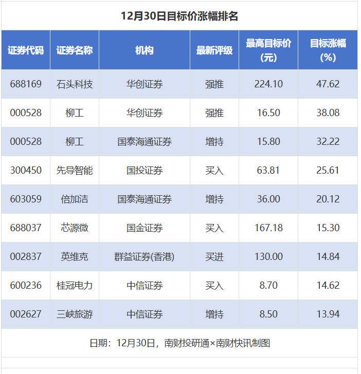 南财投研通数据显示,12月30日,券商给予上市公司目标价共9次,按最新收盘价计算,目标价涨幅排名居前的公司有石头科技、柳工,目标价涨幅分别为47.62%、38.08%,分别属于小家电、工程机械行业。