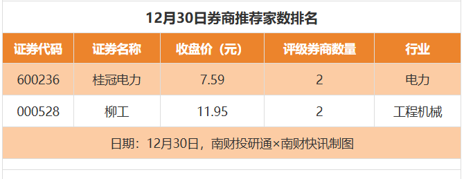 从券商推荐家数来看,12月30日有29家上市公司得到券商推荐,其中桂冠电力、柳工均获得2家推荐,皖维高新等获得1家推荐。