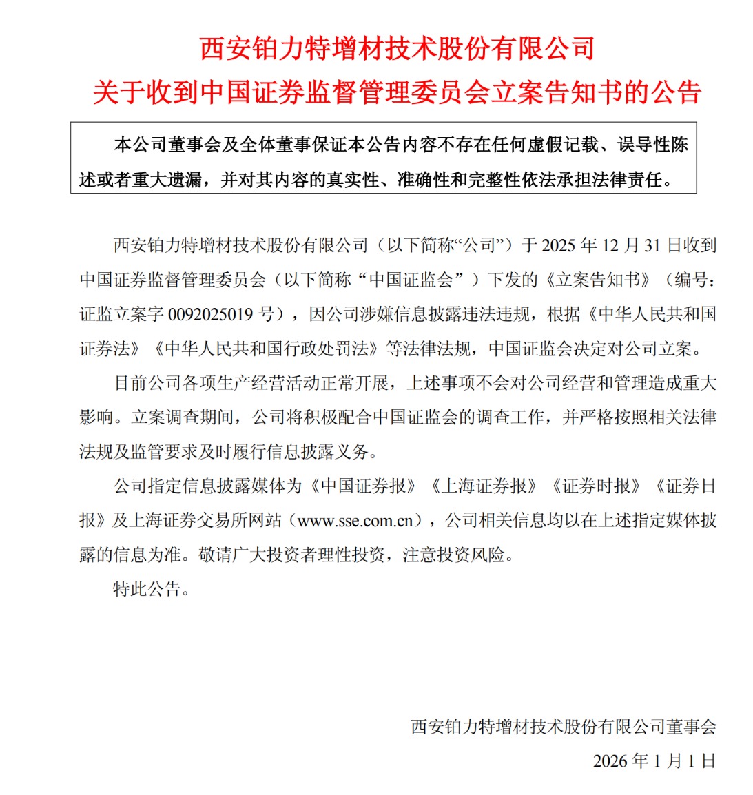 铂力特(688333.SH)今日公告称,公司于2025年12月31日收到中国证监会下发的《立案告知书》,因公司涉嫌信息披露违法违规,中国证监会决定对公司立案。