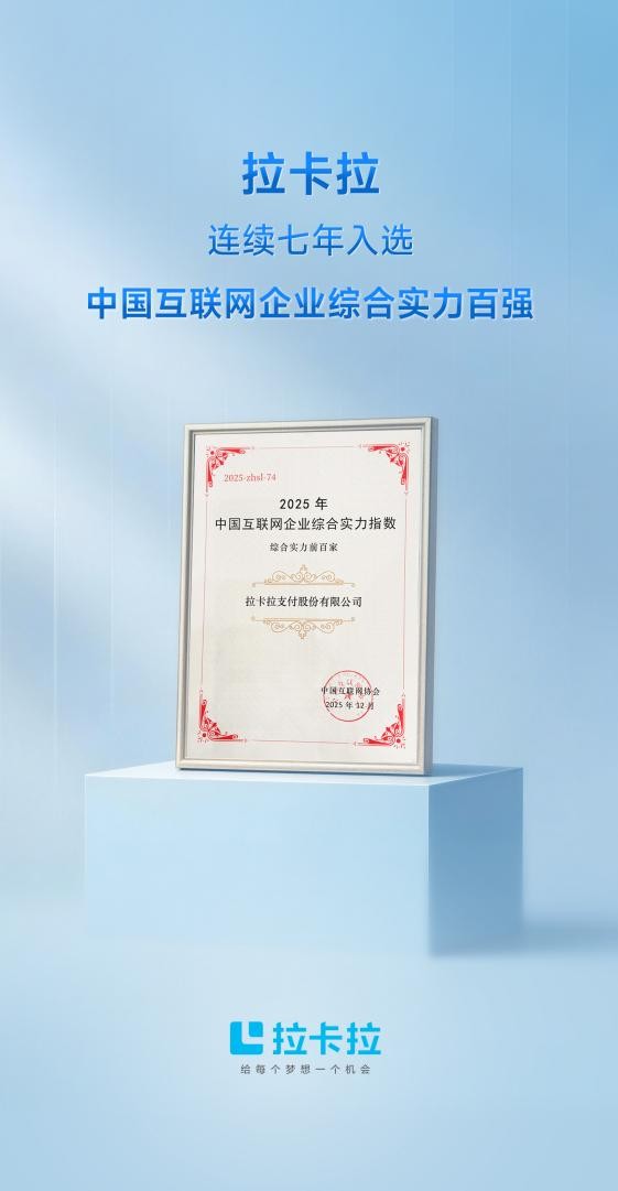2025年12月29日,中国互联网协会正式发布《中国互联网企业综合实力指数(2025)》及“2025年中国互联网综合实力前百家企业”榜单。作为国内领先的第三方支付服务商,拉卡拉支付股份有限公司(以下简称“拉卡拉”)凭借卓越的综合实力、稳健的经营表现及在数字支付领域的持续创新,再度荣登中国互联网企业综合实力百强,名列第74位,已连续七年入选。
