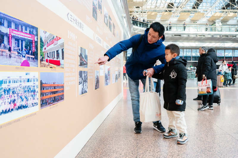 为让广大旅客共同分享三十周年喜悦,车站特别在北二楼大厅设置了主题打卡区,并配有“三十风华,京西相伴”“1996-2026,一路同行”等温暖标语,吸引大量旅客合影留念。现场还设置了“北京西站三十年大事记”专题展板,成为当天最具人气的“历史长廊”。通过珍贵的历史图片、详实的文字数据,系统梳理了车站从建设开通、历经多次扩容改造,到今日成为集高铁、普速、市郊、城际铁路于一体的铁路枢纽的辉煌历程。