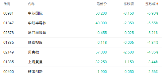 截至收盘,中芯国际(00981.HK)、华虹半导体(01347.HK)、上海复旦(01385.HK)分别下跌5.90%、5.55%、3.44%。