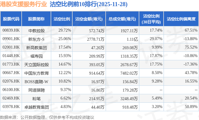 从沽空比例来看,中教控股、新东方-S、新高教集团沽空比例位居行业前三,分别为29.72%、25.06%、17.54%。