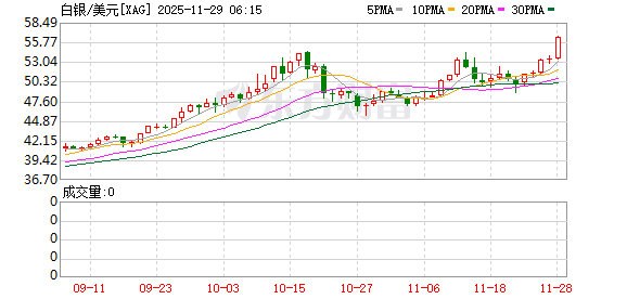 比黄金表现更亮眼的是白银,白银期现货价格均创下历史新高。截至收盘,伦敦银现价格涨5.66%,报56.397美元/盎司;COMEX白银期货价格报57.085美元/盎司,上涨6.06%。