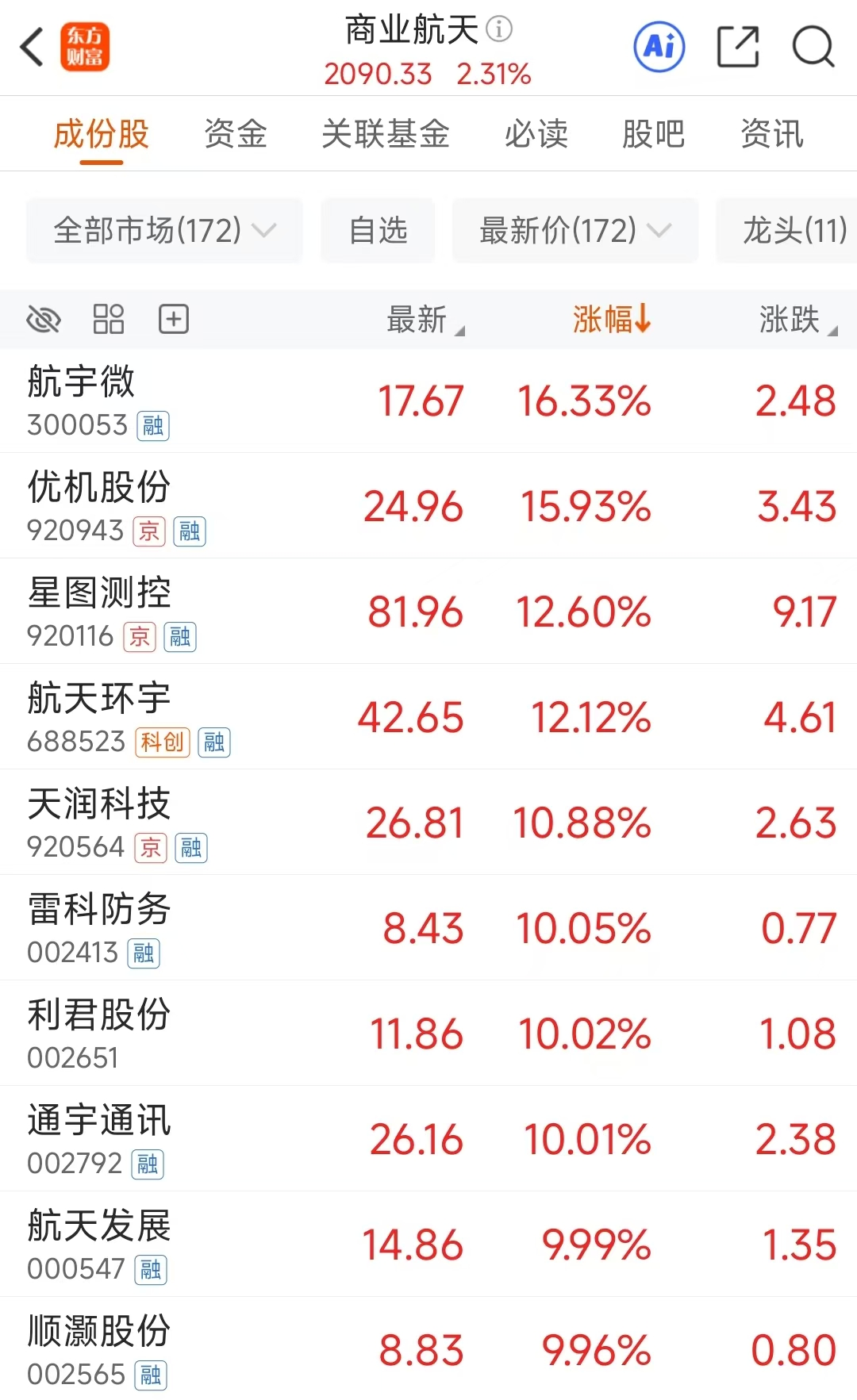 商业航天板块12月1日早盘表现强势,雷科防务、利君股份、通宇通讯、航天发展、顺灏股份纷纷涨停;航宇微、优机股份、星图测控、航天环宇、天润科技大涨超10%。