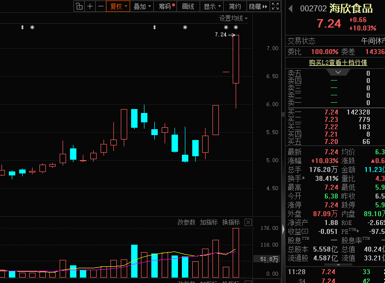 早盘,海欣食品以3.04%的跌幅开盘,一分钟内迅速跌停,随后在跌停线附近震荡走势。开盘一小时后,海欣食品股价快速拉升,11时前封死涨停板,截至午间收盘,仍有14.23万手买单封板,封单资金达到1.03亿元。
