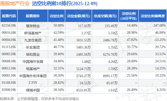从沽空比例来看,建发物业、新鸿基地产、九龙仓集团沽空比例位居行业前三,分别为50.08%、42.59%、41.48%。