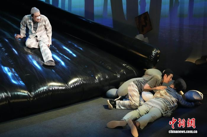 舞台上到处是散落的石块、歪掉的路牌,俨然是一场“车祸现场”,可占据视野的并不是公路,而是高达3米的充气滑梯——《行路人》以极具特色的舞台美术营造出超现实的象征意味。“光滑弹性的滑梯看似没有危险,可不假思索地滑下去才发现是悬崖、是回不去的路。”林丛表示,在这样巨型装置的笼罩下,台上发生的一切更增添了一份“纯属虚构”的抽象感。