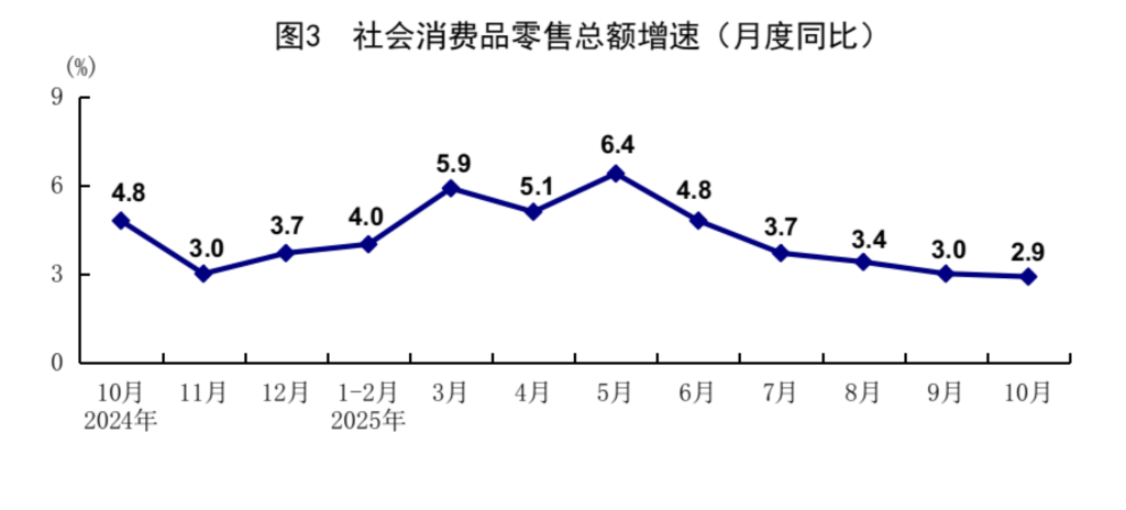 国家统计局数据显示,10月份社会消费品零售总额同比增速回落主要是受占比较大的汽车销售走弱影响,扣除汽车类商品后消费品零售额增长4.0%,比9月份加快0.8个百分点。