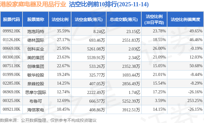 由于港股人民币柜台交易股票成交金额较小,沽空比例普遍偏高,为了避免干扰,已将人民币柜台交易股票从排行表格中剔除。