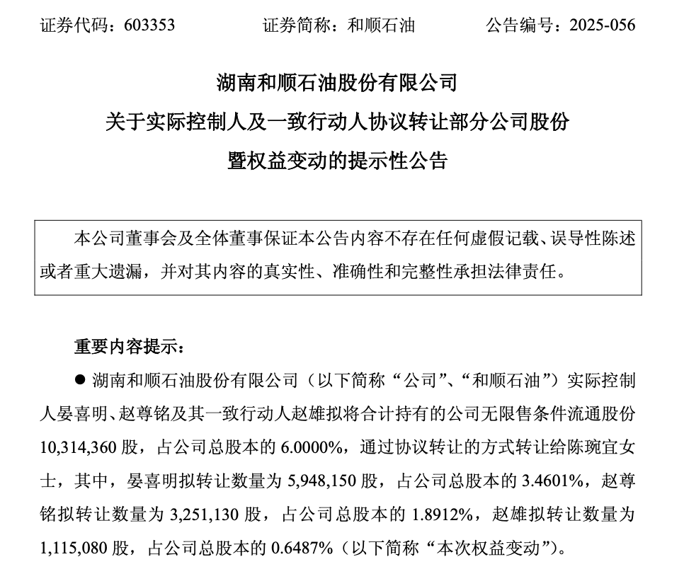 同日,和顺石油实际控制人晏喜明、赵尊铭及其一致行动人赵雄与陈琬宜签订《股份转让协议》,约定晏喜明、赵尊铭及赵雄拟通过协议转让的方式向陈琬宜合计转让公司6%股份。