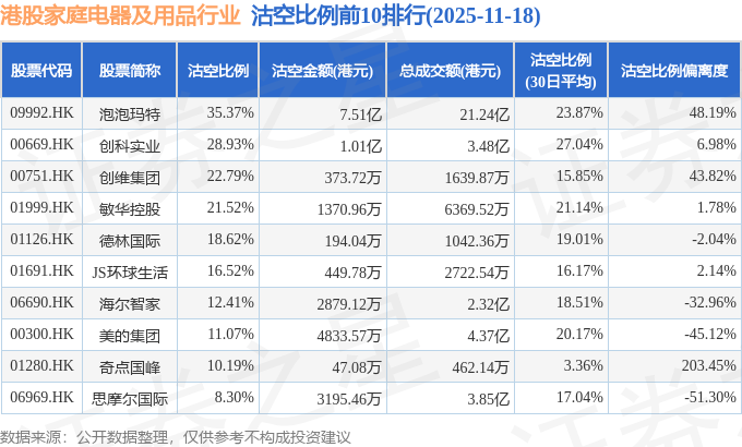由于港股人民币柜台交易股票成交金额较小,沽空比例普遍偏高,为了避免干扰,已将人民币柜台交易股票从排行表格中剔除。