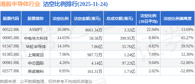 从沽空比例来看,ASMPT、中电华大科技、华虹半导体沽空比例位居行业前三,分别为26.08%、14.65%、14.1%。